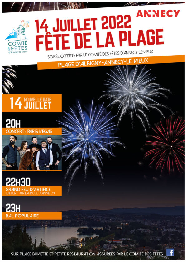 20 H – PARIS VEGAS Concert (groovy, funk, disco) 22 H 30 – FEU D’ARTIFICE Offert par la ville d’Annecy 23 H – BAL POPULAIRE Offert par la ville d’Annecy Sur place : buvette et petite restauration assurées par le Comité des Fêtes. Soirée offerte par le Comité de Fêtes d’Annecy-le-Vieux