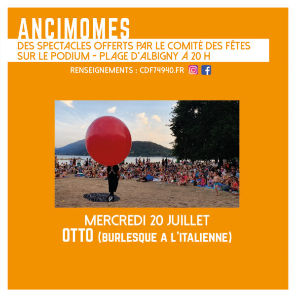 ANCIMÔMES, des spectacles offerts par le Comité des Fêtes sur le podium, Plage d’Albigny à 20h. Ce mercredi 20 juillet, retrouvez OTTO et son burlesque à l’italienne !